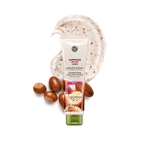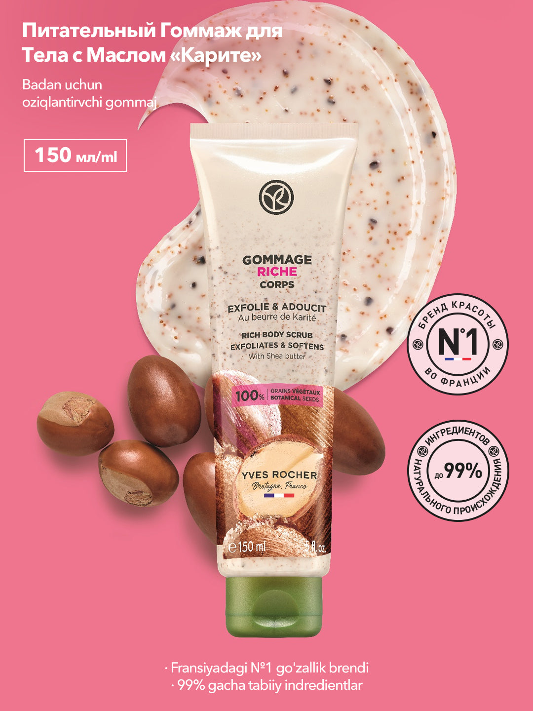 Питательный Гоммаж для Тела с Маслом Карите Отшелушивающий гоммаж, обогащенный маслом Карите и его молотой скорлупой, бережно удаляет омертвевшие клетки кожи. Окутанная его богатством кожа, одним движением обретает комфорт и мягкость! Принимая душ, нанесите на тело гоммаж массажными движениями, потом тщательно смойте водой. Используйте 1 или 2 раза в неделю.