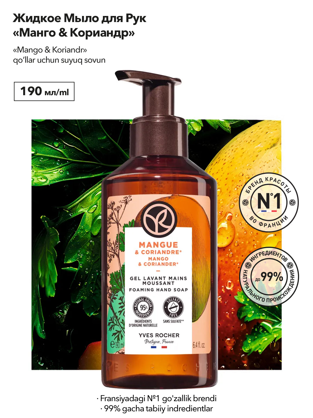 Прикоснитесь к самой природе с этим жидким мылом для рук с пленительным ароматом и формулой без сульфатов и красителей. Аромат: пикантная свежесть Кориандра, дополненная яркими, искрящимися нотами Манго, заряжает бодростью и пробуждает чувства.